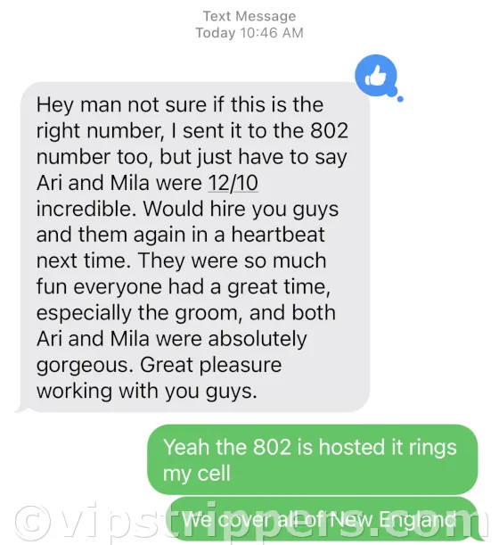 Killington, VT (Boston customers): Thank you VIP Strippers for a great night at Killington. Joey and Brianna were a perfect pair to get our bachelor party going. They are both hot and I actually won a bet with some of the guys because Meni delivered what he promised. Our group wanted more, so VIP was able to arrange a round 2 with Brooke and Nevaeh at the last minute. Our entire group was very impressed with the entire night. I don’t see a reason to look anywhere else for entertainment in the future. Thanks again!