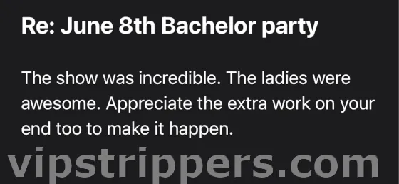 Chittenden, VT: The fellas and I had an unforgettable experience recently with VIPStrippers. It was our first bachelor party and Meni helped us figure everything out in a very prompt and professional manner. The girls (Lexi and Jacy) were top-notch; friendly, outgoing, and most of all, smokin hot! They arrived right on time, and before we knew it they were getting right down to business. Even the bouncer was cool! Great show! Hopefully we will have the chance to use VIPStrippers again in the future. Thanks!
